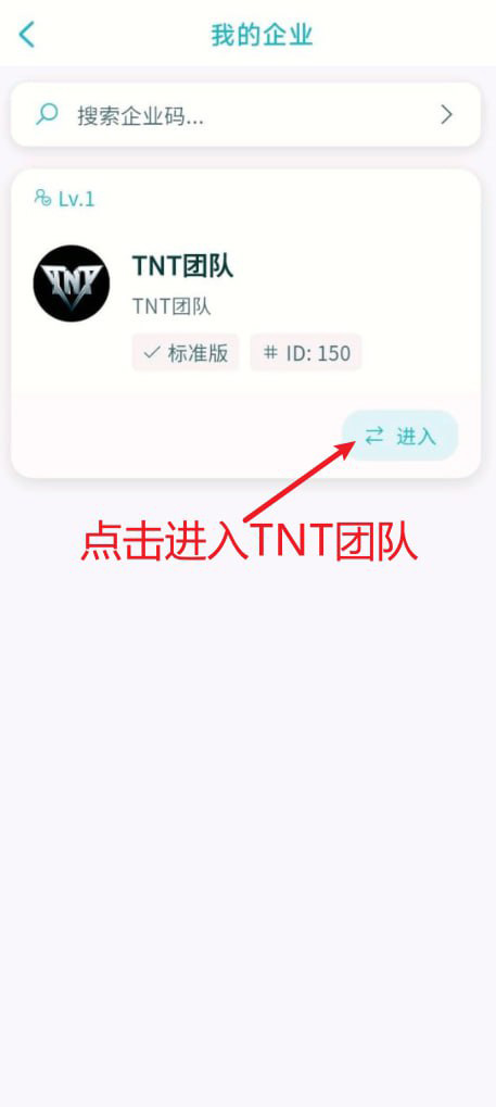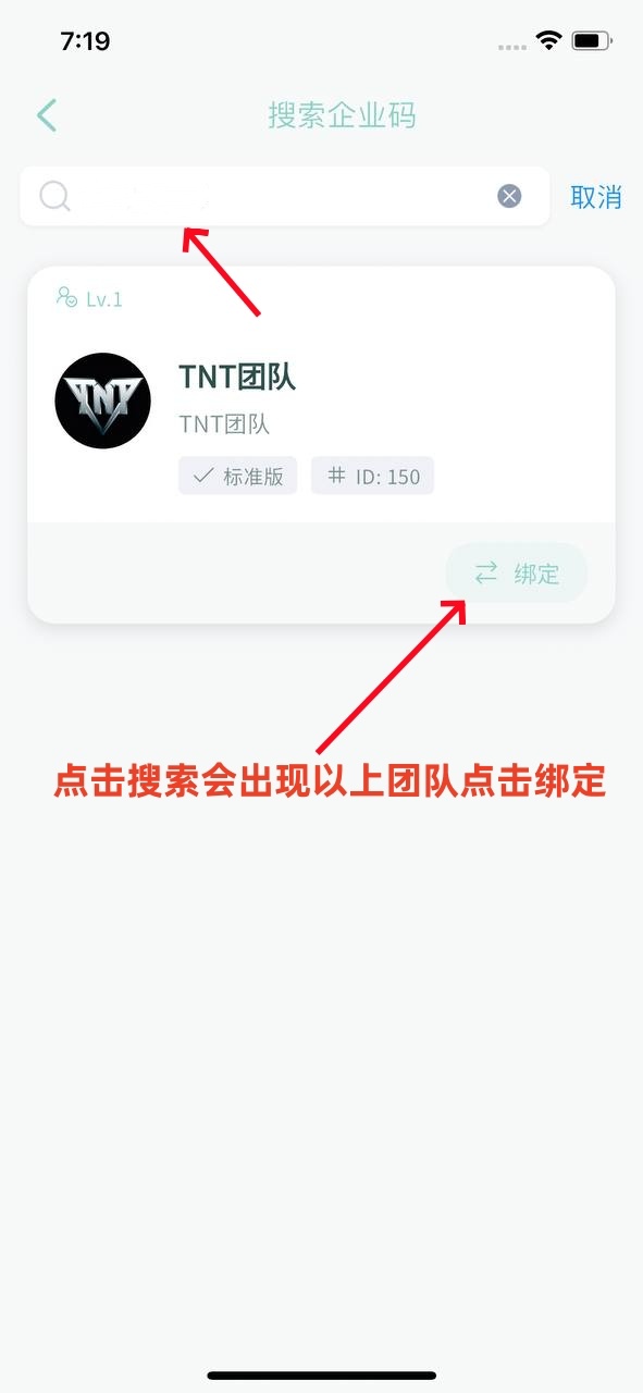 4.搜索框输入企业码【TT068995】搜索TNT团队点击绑定